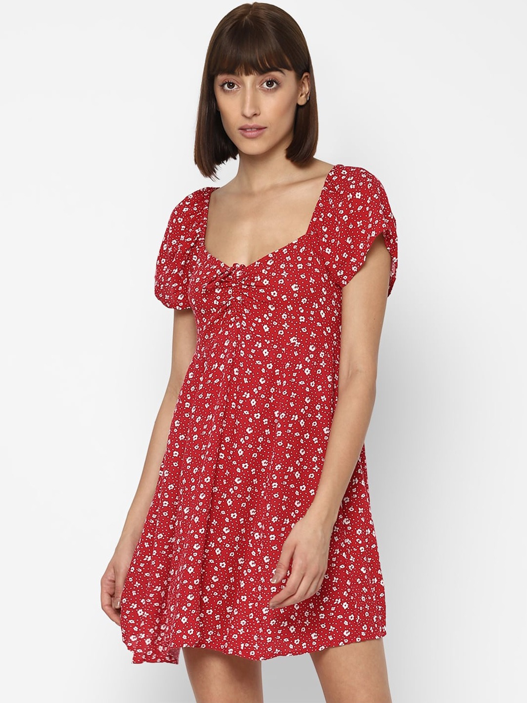 This red and white floral print A-line dress is chic and trendy. This sweetheart neck design and short sleeves will make you look thin and sexy.